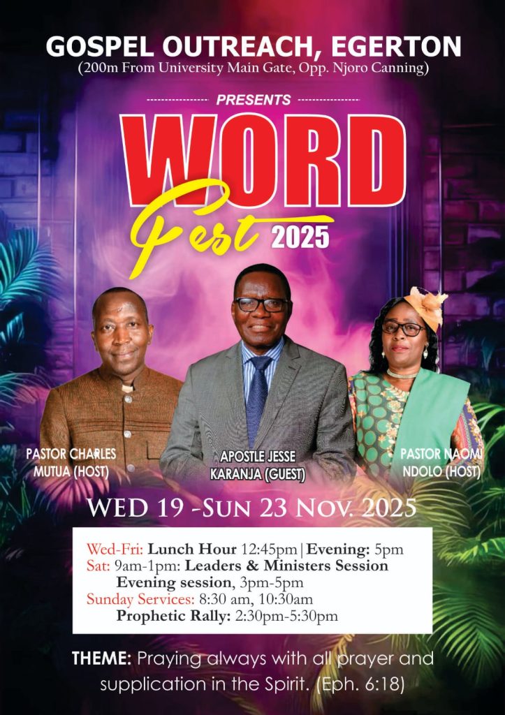We are excited to invite you to Word Fest 2025, a power-packed conference hosted at Gospel Outreach Church โ€“ Egerton. Our guest speaker is Apostle Jesse Karanja, a veteran of the Gospel and the founder of Mizpah House of Prayer, Mizpah School, and Mizpah TV in Nakuru County.